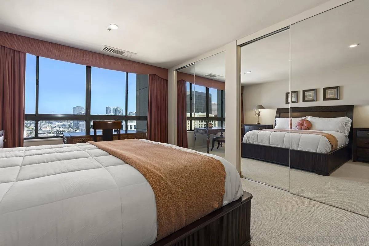 The classic elegance that infuses the entirety of the iconic Meridian building is especially apparent in this extra-spacious one-bedroom, one-and-a-half-bathroom unit. Rich, dark wooden hues and decadent upholstery with a chic safari flare characterize this upscale space that benefits from high ceilings and enchanting city views. The primary bedroom suite boasts a California king-size bed, a full wall of closet space with two double-door mirrored closets, and custom-built-in shelving. A robust desk is thoughtfully positioned in front of large windows providing ample natural light, perfect for those looking to work from home. The luxurious ensuite bathroom is finished in gleaming marble, and includes a spa bathtub, freestanding shower, double sink vanity, and a separate space with a toilet and bidet. Other perks include a powder bathroom in the entry area, ideal for guests, and ample storage throughout the unit—with built-in cabinets in the living room and a large pantry in the laundry room. Within the Meridian building in the heart of the Marina District! This locale offers a perfect dose of urban appeal and access to recreational areas, just minutes from the San Diego Convention Center, Seaport Village, The Embarcadero, The New Children's Museum and the Gaslamp Quarter—areas rife with spots to peruse boutique shops or to grab a tasty bite and brew. The close by Martin Luther King Jr. Promenade offers a superbly landscaped linear park that is a favorite for pedestrians, joggers, dog walkers and families alike, as the Children's Park is located along the promenade.